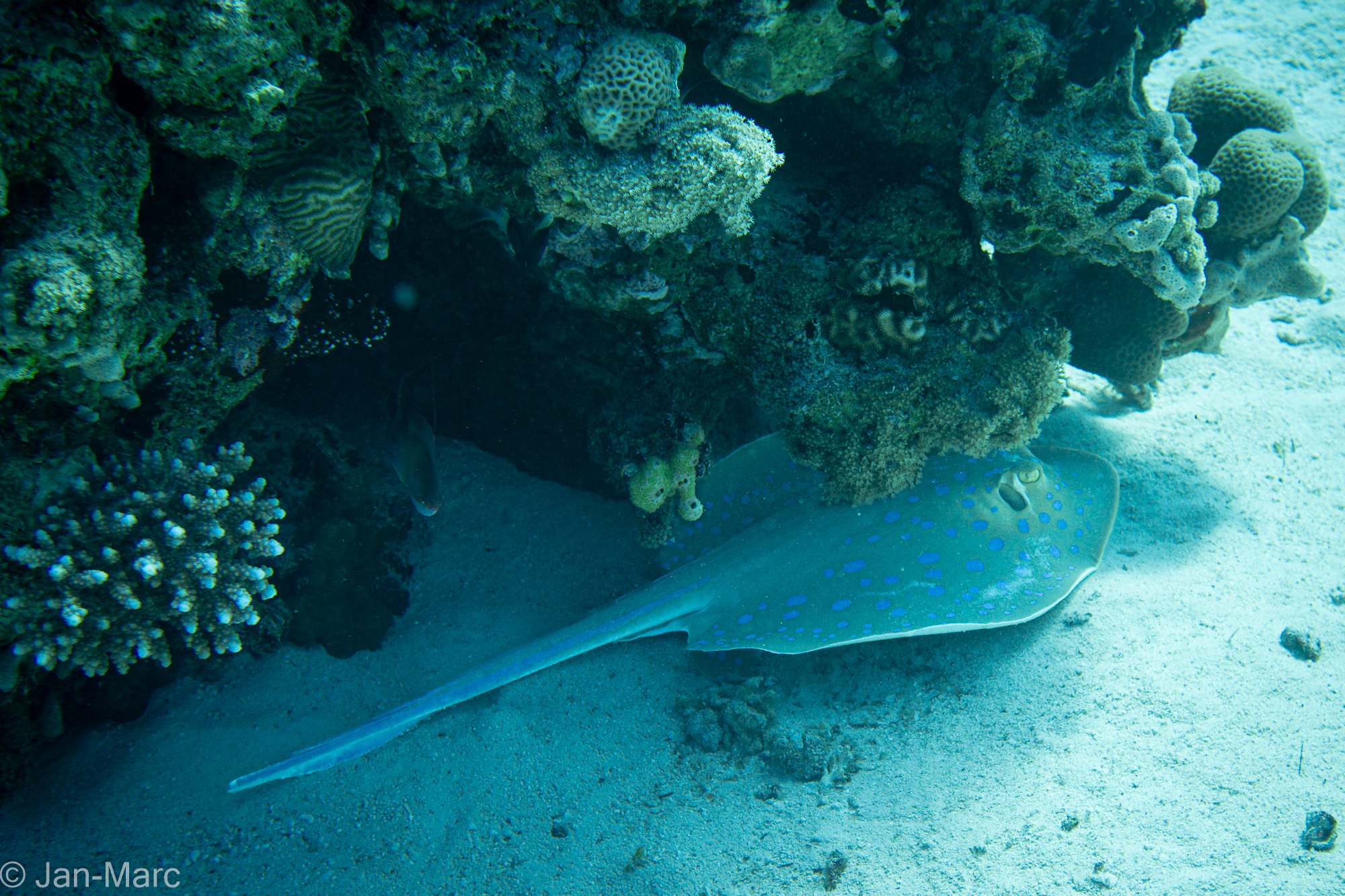 Bei einem meiner Tauchgänge hatten wir eine besonders schöne Begegnung: In etwa zehn Metern Entfernung zog ein großer Federschwanzrochen ruhig an uns vorbei. Für einen Moment glitt er nahezu lautlos über den sandigen Meeresboden und verschwand dann langsam zwischen den Korallen – ein eleganter Anblick und einer dieser kleinen Augenblicke, die einen Tauchgang besonders machen.